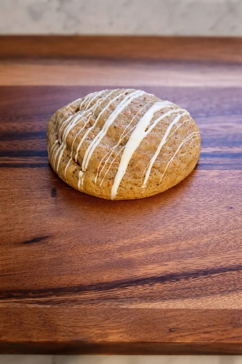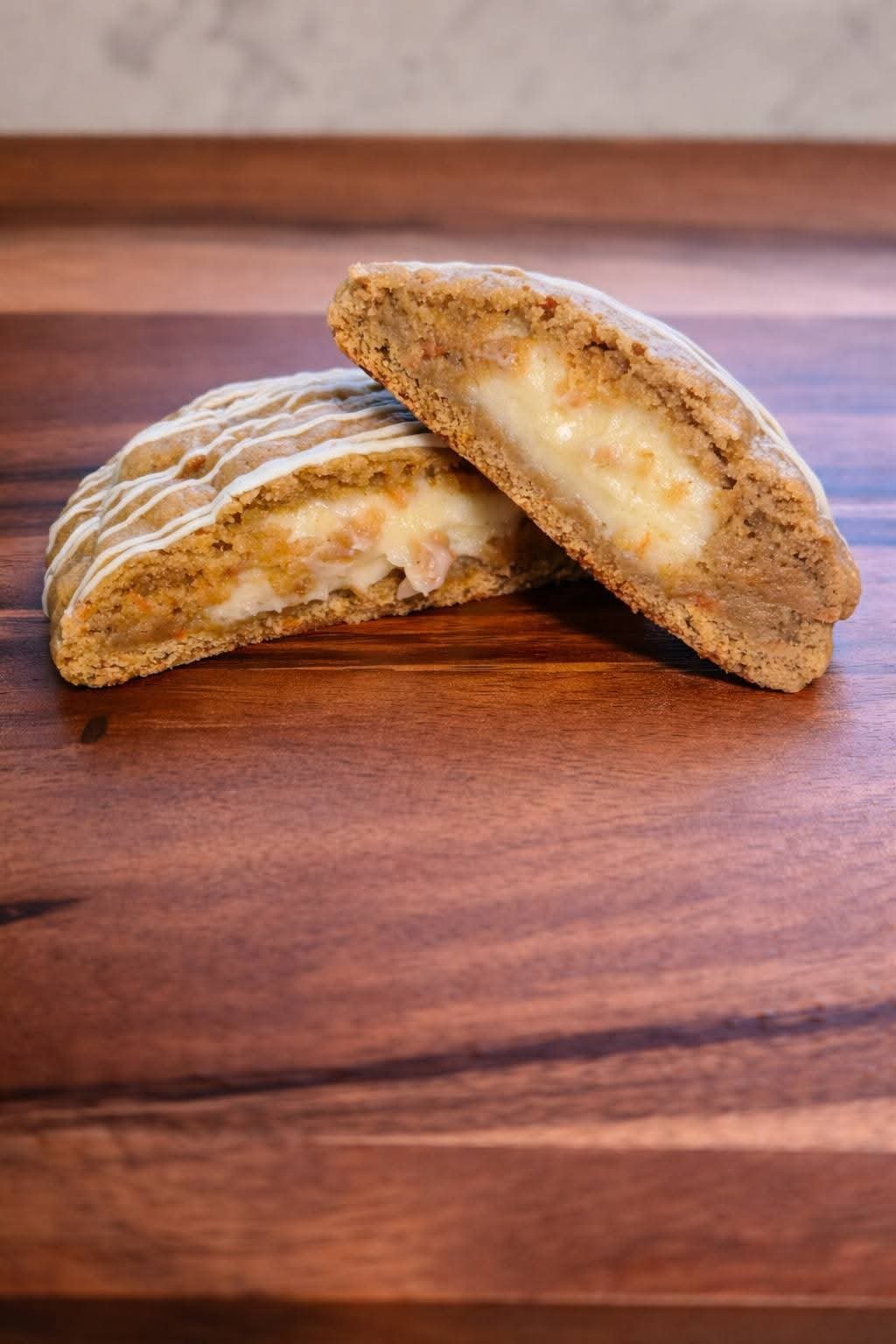 A super soft carrot cake cookie stuffed with a creamy cheesecake center and drizzled with cheesecake chips. It’s giving bakery case main character.